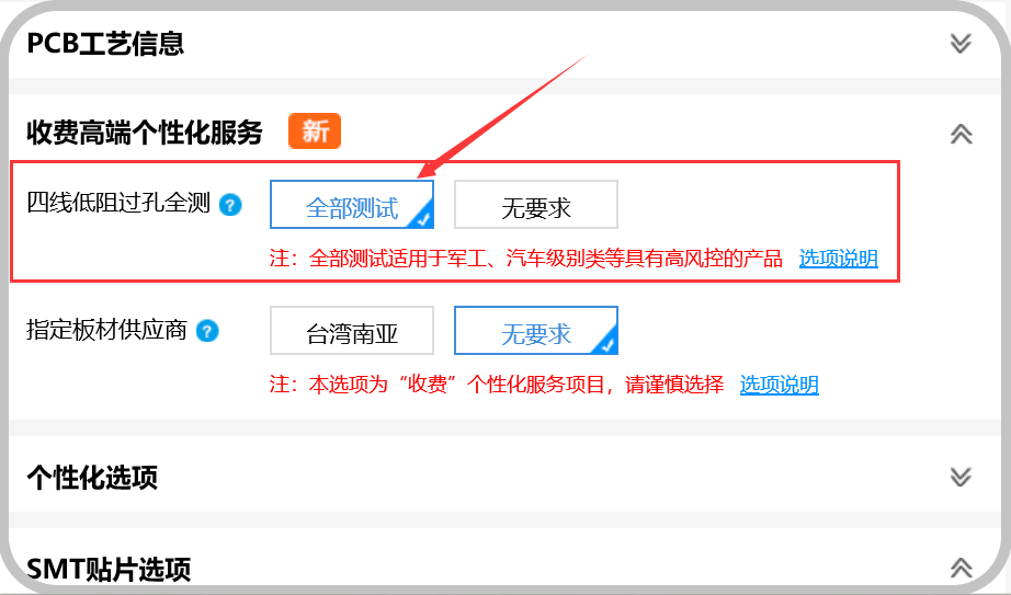 二:提供增值服務(wù):嘉立創(chuàng)4層板及雙面板全部引入四線低阻抽測管控以防批量性隱性壞孔的同時,也提供了更為高端的增值服務(wù),如果客戶認為你的板子的風控性更高,價值更高,不允許任何PPM,則可以選擇四線低阻全測,嘉立創(chuàng)成為行內(nèi)第一家線上提供四線低 阻測試選擇的廠家,如下圖: