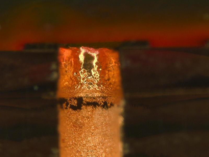 上圖中的孔,過孔中間似連非連,在99%的PCB工廠包括2019年5月前的嘉立創(chuàng)都是采用普通的飛針測試機及通用測試機進行測試,根本就測不出上面圖片的”隱性壞孔“,這個孔只能用“四線低阻測試機”測出,因為“四線低阻測試機”測試精度能達到微歐級別,而普通的“飛針測試機及通用測試機”只能達到歐姆級別,是好孔還是隱性壞孔則全部體現(xiàn)在電阻值的大小上,如果一個過孔達到了4微歐則一定是隱性壞孔,而4微歐對于普通的針測則是好孔,萬用表對于隱性壞孔也是無能為力,這就是隱性壞孔的可怕之處,所以軍工板及汽車板則必須全部低阻測試!