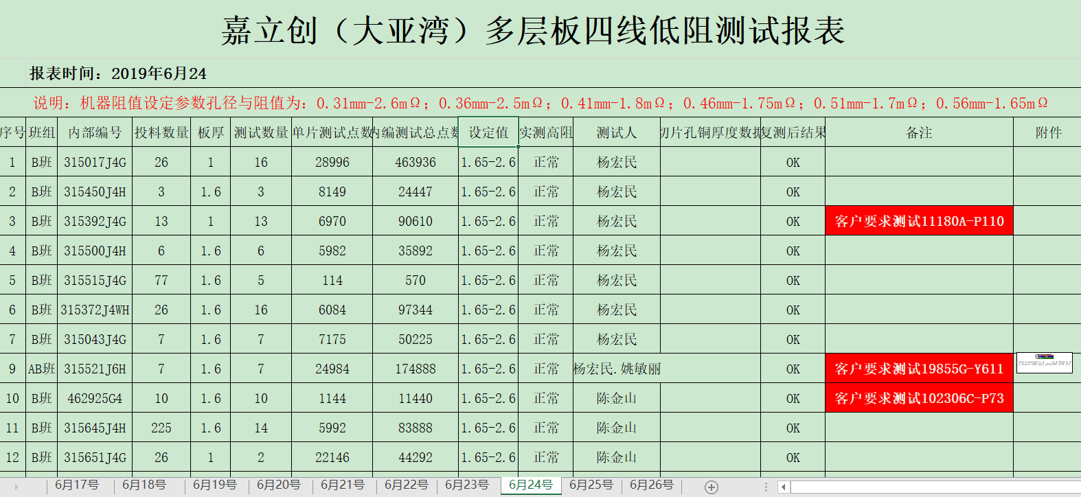 四:批量性四線低阻管控: 嘉立創(chuàng)工廠每天四線低阻測試管控記錄報告: