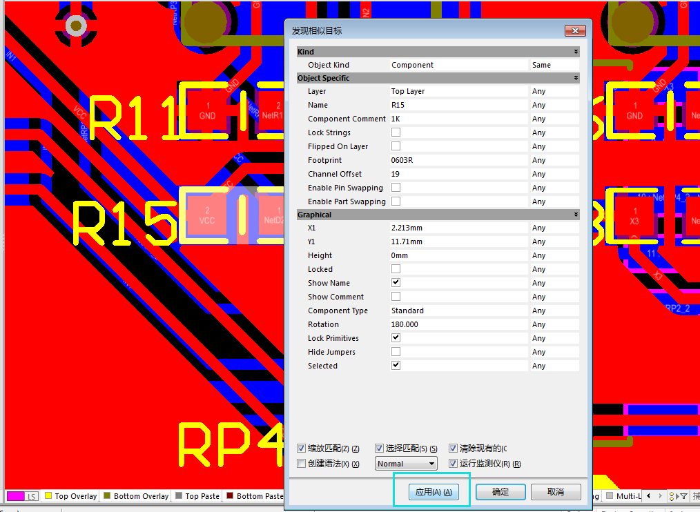 首先點(diǎn)中一個(gè)器件,右鍵找到查找相似對象然后直接應(yīng)用,不要改任何設(shè)置。器件就都會(huì)選中,然后確定,去掉勾選Show Name字符就消失了,大家可以試試!