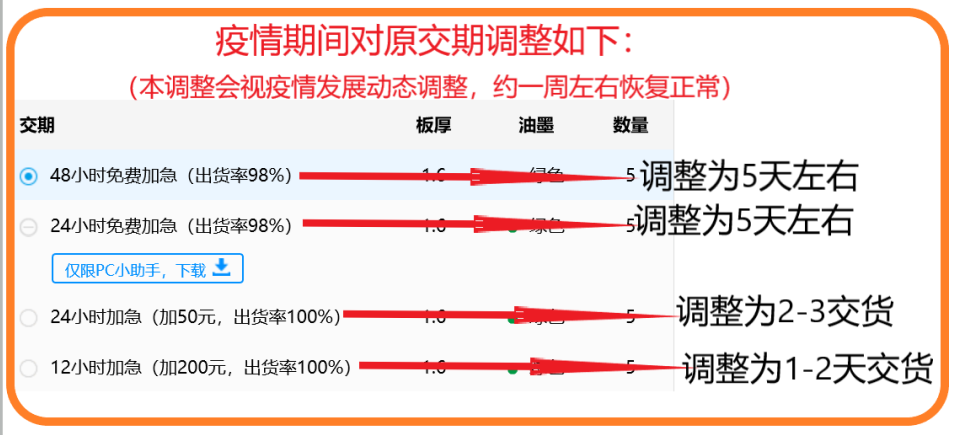 1:用于武漢疫情的收費加急訂單------其它收費加急訂單------普通樣板訂單-------普通小批量訂單 , 現(xiàn)在下單的樣板交期大約如下(系統(tǒng)上顯示的交期無效):