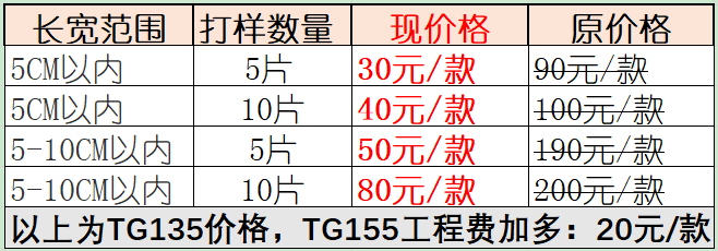 2)單片出貨長(zhǎng)寬在5-10CM以內(nèi)打樣5片僅需:50元/款全國(guó)包郵!