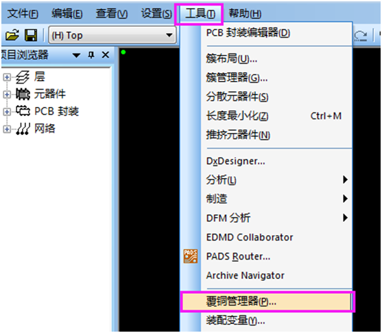 線路板打樣的時候,在我們設(shè)計好文件后,檢查文件沒有任何問題的情況下,必須要做的步驟,首先進入工具找到敷銅管理器。