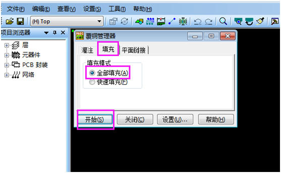 進入到敷銅管理器后會出現(xiàn)下圖對話框,請一定要選擇填充(hatch)