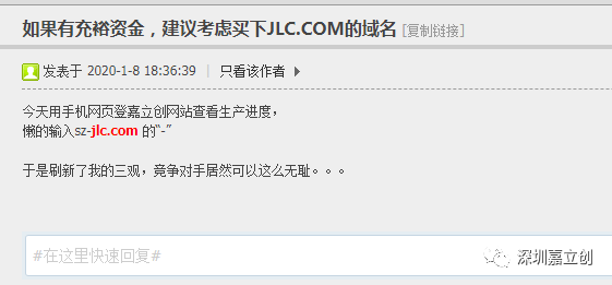 若干年后:XXX同行公司高管,盯著嘉立創(chuàng),在海外購(gòu)買(mǎi)了WWW.SZJLC.COM的域名。當(dāng)客戶(hù)要訪(fǎng)問(wèn)深圳嘉立創(chuàng)官網(wǎng)域名:WWW.SZ-JLC,少輸個(gè)“-”時(shí),結(jié)果直接設(shè)置跳轉(zhuǎn)到XXX同行網(wǎng)站,再度來(lái)一個(gè)李鬼與李魁的故事,我方人員在曉明利害關(guān)系私下從xxx同行買(mǎi)下這域名,XXX同行還以此事為自己美化,就像做了壞事,然后賠理道謙了還理直氣壯!