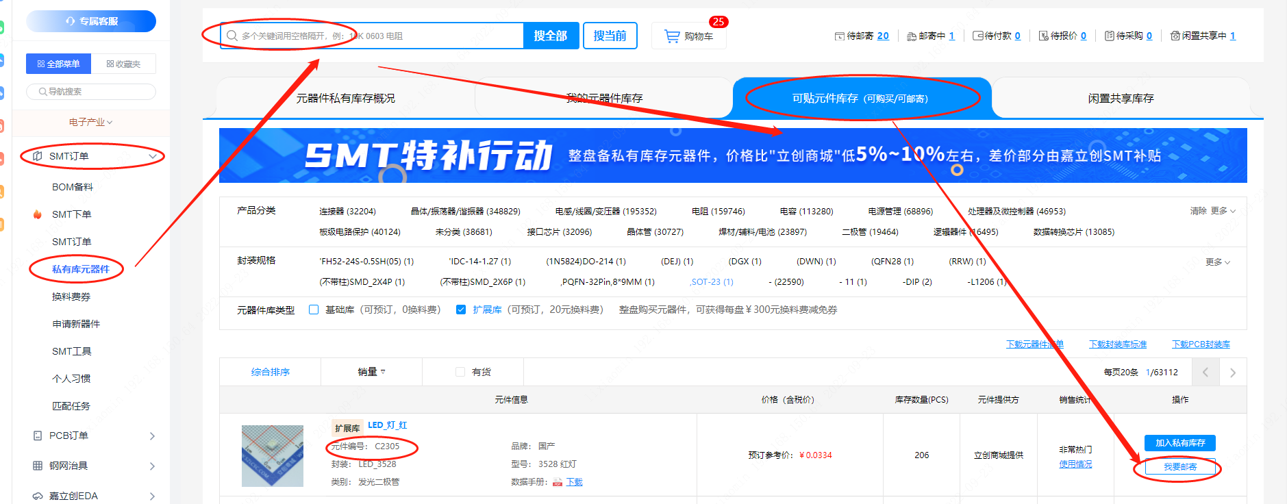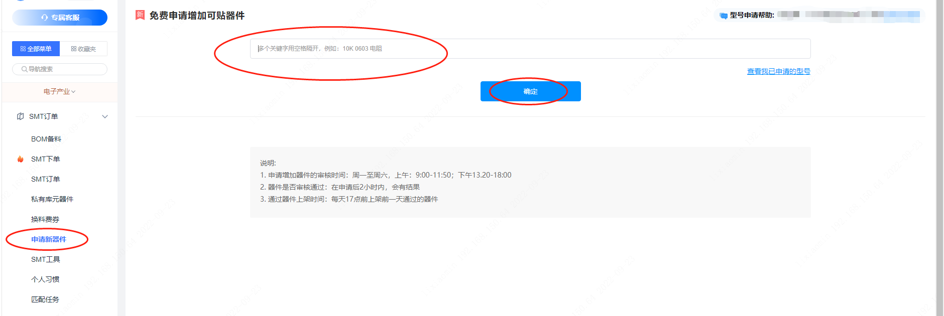答:必須先申請(qǐng)把這個(gè)器件添加到可貼元器件列表中。嘉立創(chuàng)審核通過(guò)后,并顯示“已上架”后就可以寄料,操作如下: