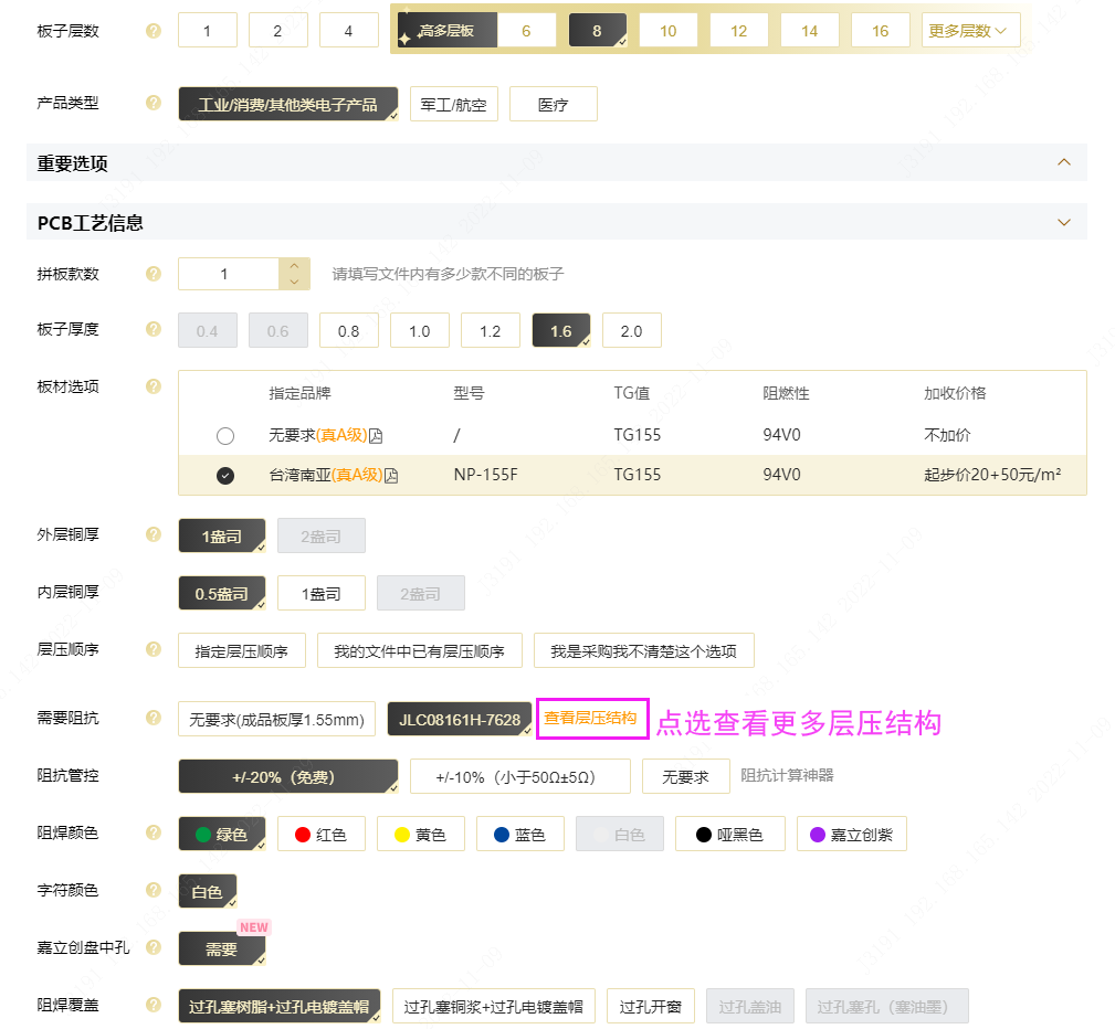 目前系統(tǒng)已開通4-32層的多層板制作,更多的層壓結(jié)構(gòu)請?jiān)谙到y(tǒng)中查看: