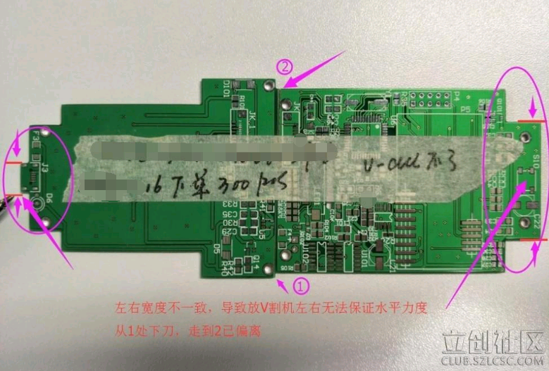 在看看另一種拼板,因左右無(wú)法保證水平,造成的V割偏位。