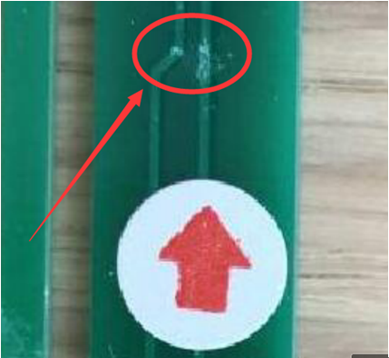 4)肉眼觀查下不接受綠油修補(bǔ)的劃痕;