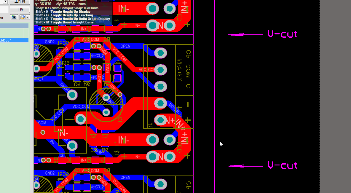 選擇“keep-out”層,進(jìn)行繪制。在工藝邊上加上“定位孔”及“Mark點(diǎn)”,最后用任意一層如“Overlay”層或“keep-out”層,標(biāo)注V槽。到此,整個(gè)拼板過(guò)程完成,如下圖所示。