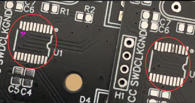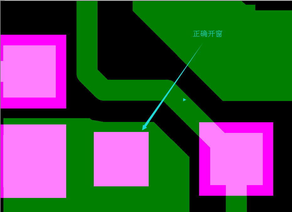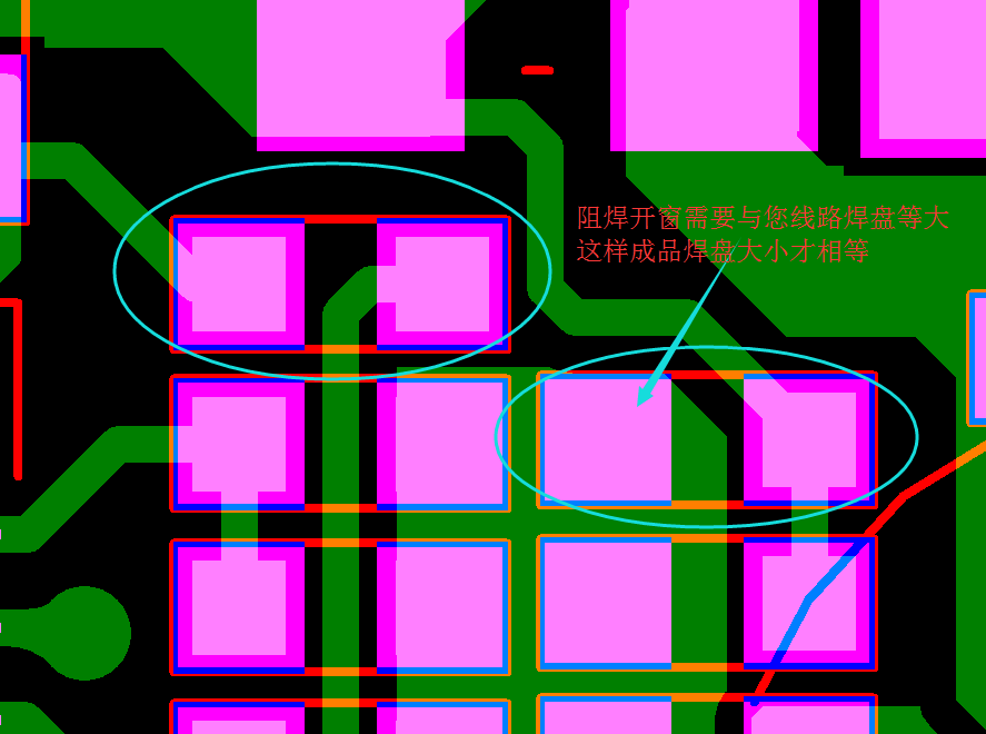 另一種情況開窗區(qū)域內(nèi)有線路或銅皮的,會露出來跟焊盤鏈接在一起,這樣會比沒有線路或銅皮鏈接的獨立焊盤端多出了一部分露銅部分,成品做出來看上去會有長短不齊的現(xiàn)象,其實這些都是您阻焊開窗布線要考慮到的。