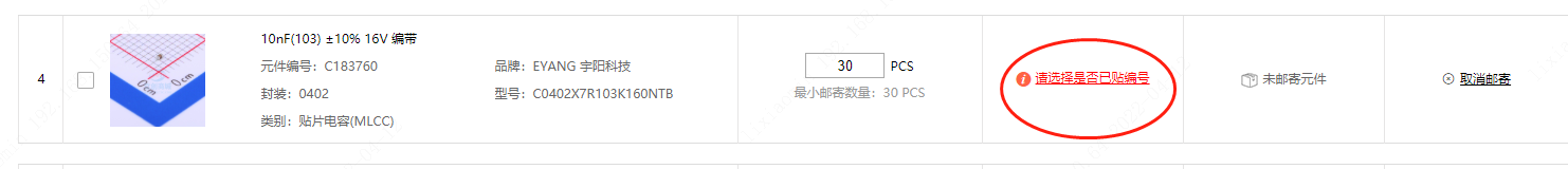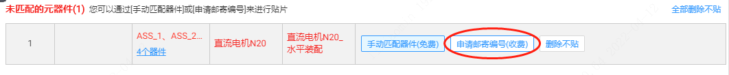 第一步:在下SMT訂單選器件界面,未匹配到型號(hào)的器件,可以直接郵寄,可以點(diǎn)【申請(qǐng)郵寄編號(hào)(收費(fèi))】