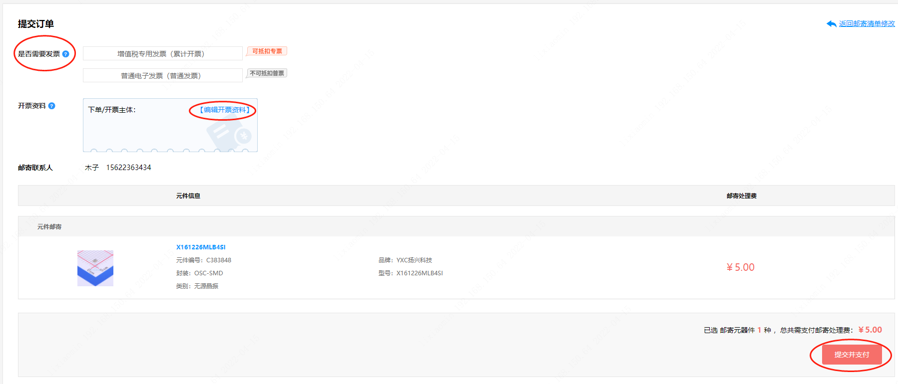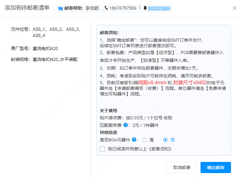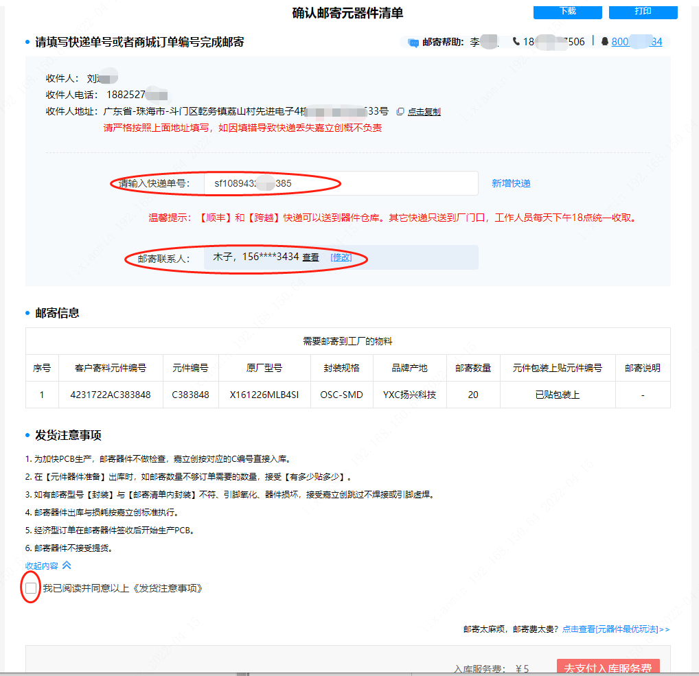 第十步:點(diǎn)完后會(huì)彈出確認(rèn)郵寄元器件清單頁面,這個(gè)頁面需要您下好快遞(記得在每個(gè)需要郵寄的器件包裝袋上寫好器件編號(hào)),下好后回來填好【快遞單號(hào)】、【郵寄聯(lián)系人】,閱讀并勾選發(fā)貨注意事項(xiàng)。