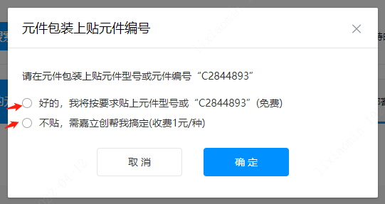 (1)點(diǎn)【請(qǐng)選擇是否已貼編號(hào)】會(huì)出現(xiàn)選擇彈窗,在元件包裝上勾選由客戶自己貼或嘉立創(chuàng)貼元件編號(hào),并補(bǔ)充元器件的基本封裝信息。