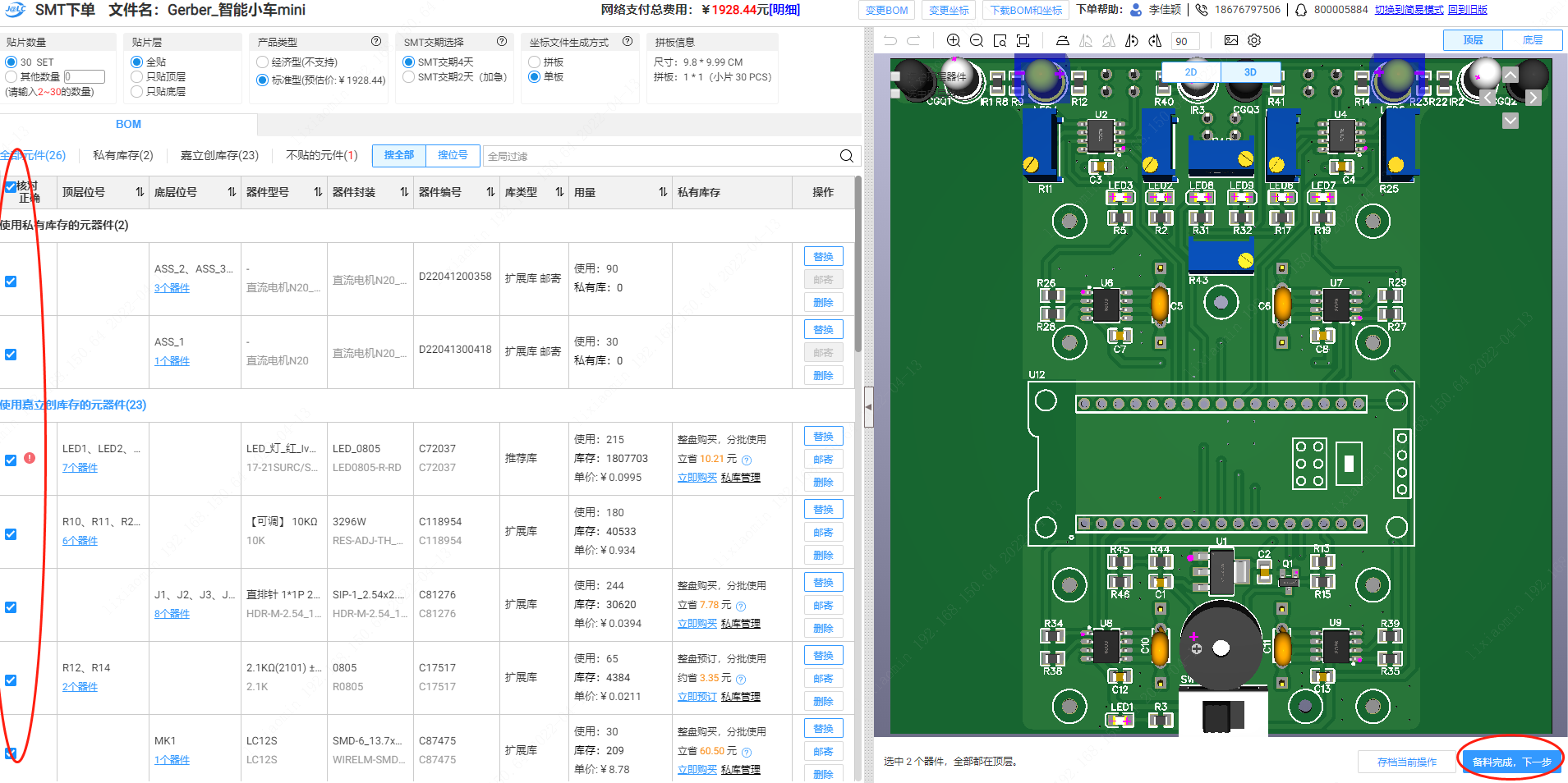 第四步:確定好需要郵寄的器件型號(hào),勾選【核對(duì)正確】,要確保所有都勾上,匹配完成后,然后點(diǎn)【備料完成,下一步】