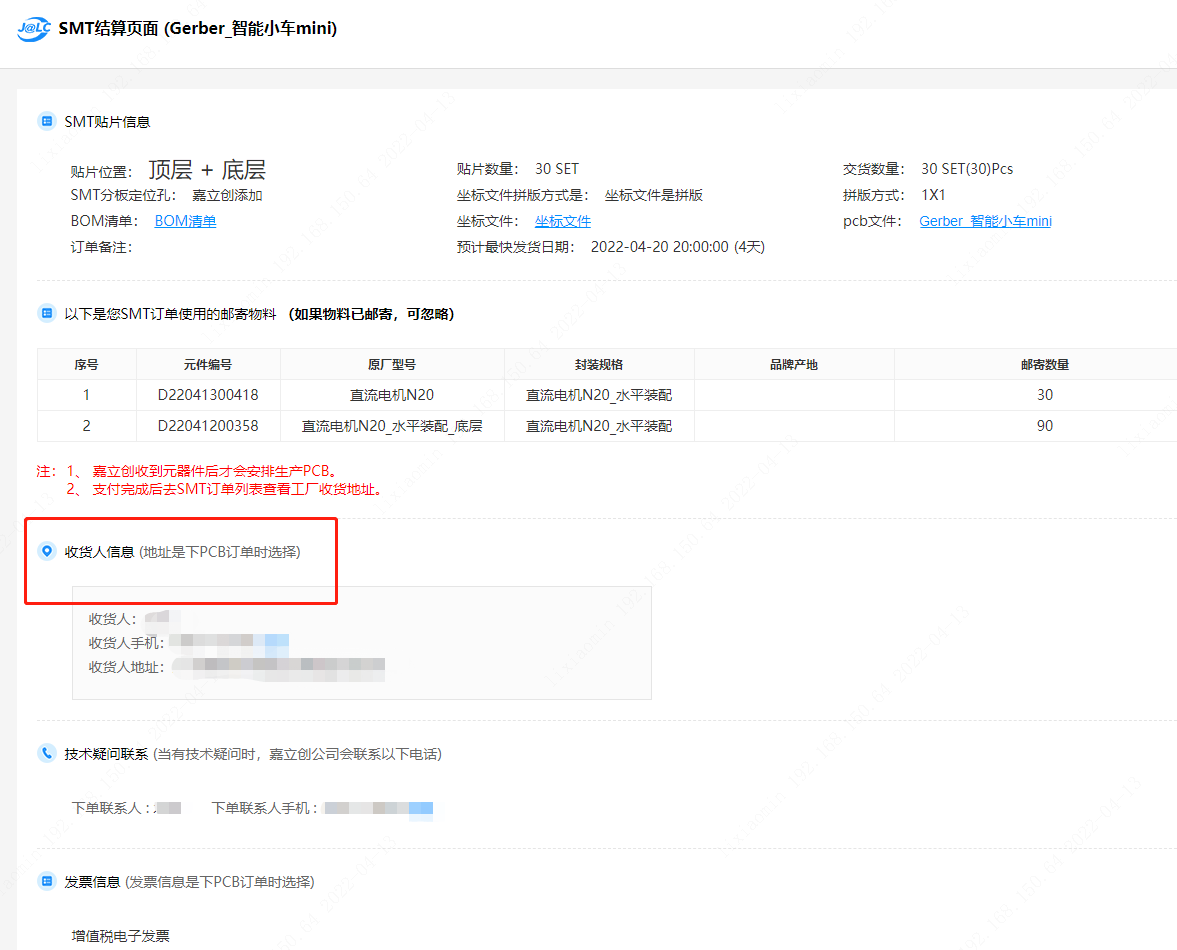 第六步:選擇處理方式后,會(huì)彈出SMT結(jié)算頁面。核對(duì)好【收貨人信息】等信息