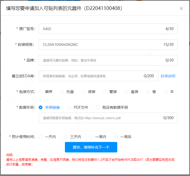 點(diǎn)擊【待補(bǔ)全元件信息】,會(huì)彈出“填寫您要申請(qǐng)加入可貼列表的元器件”的頁面,需要客戶提供元器件型號(hào)的尺寸信息。