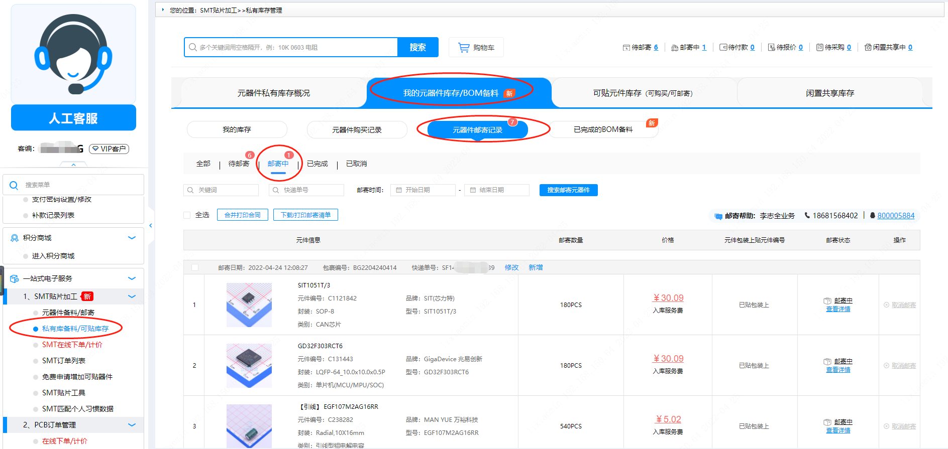 在【私有庫備料/可貼庫存】的菜單中,點(diǎn)“我有元器件庫存/BOM備料”字樣,再點(diǎn)擊【元件郵寄記錄】,可以看到郵寄的各種狀態(tài)。在【郵寄中】的狀態(tài)可以“修改”或者“新增”快遞號(hào)信息。