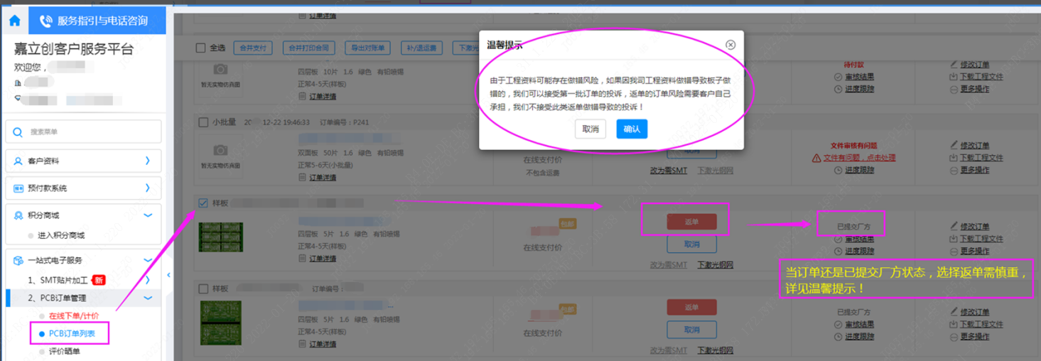 個別情況樣板還沒發(fā)貨就返單生產(chǎn)的,需注意一下溫馨提示里的內容: