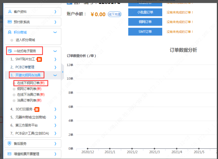 登錄系統(tǒng)后,在系統(tǒng)左側(cè)的菜單欄,找到“開激光鋼網(wǎng)”目錄,下面的“在線下鋼網(wǎng)訂單”。