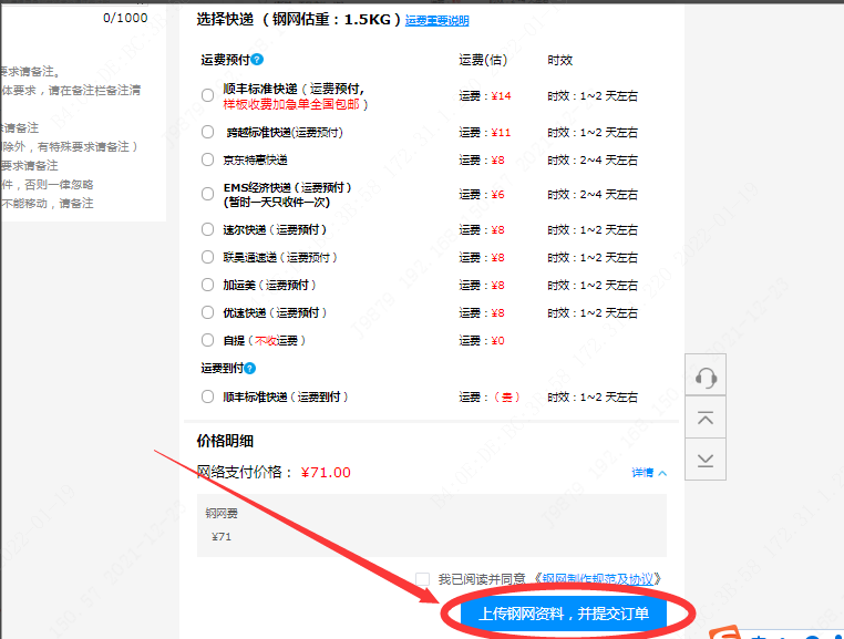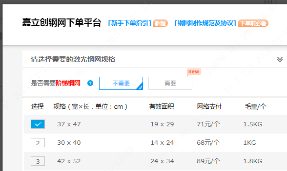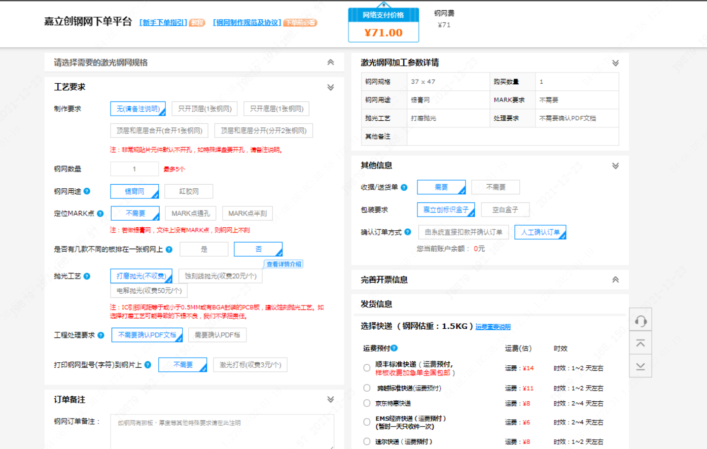 2、下單頁面從上到下,從左到右依次填寫鋼網(wǎng)工藝要求及收貨信息,選擇好快遞、收據(jù)和發(fā)票等信息。