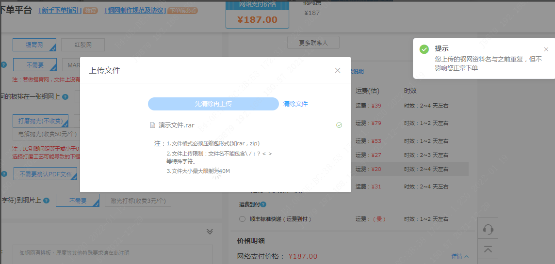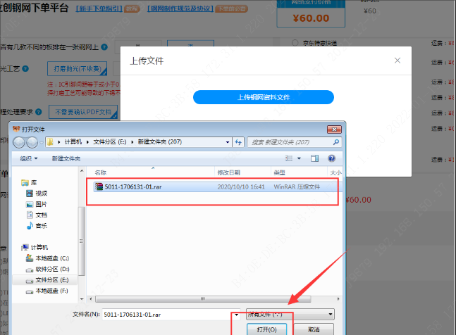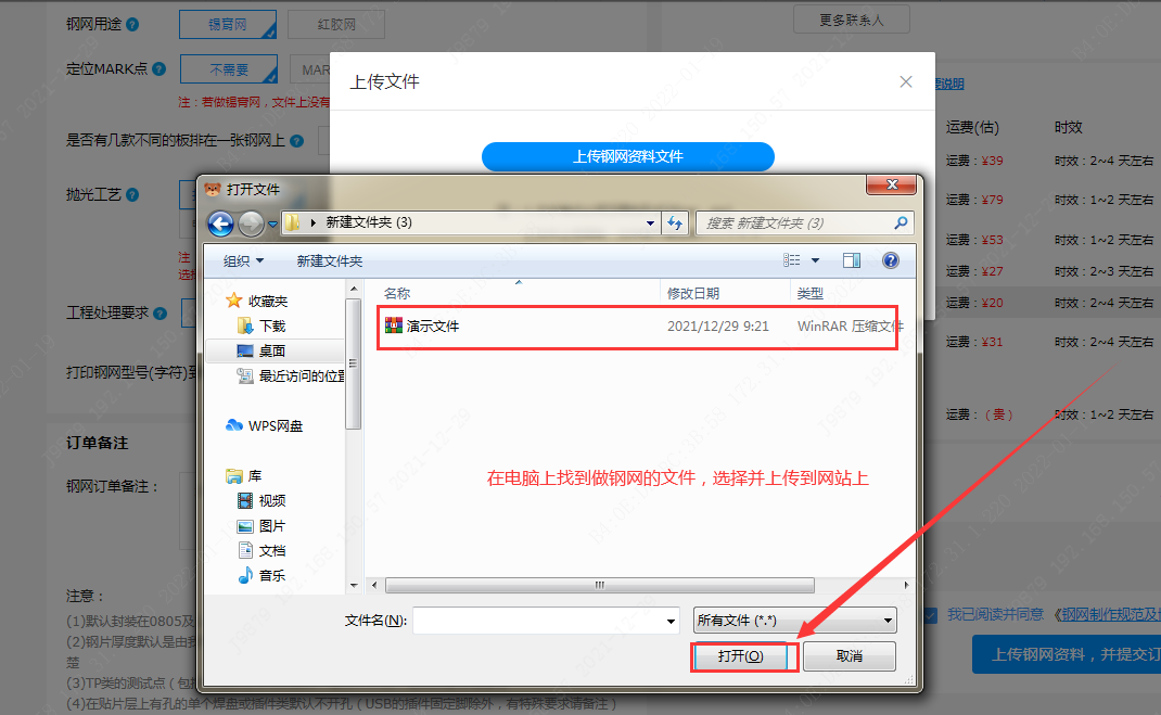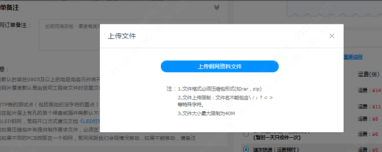 選好工藝及收貨信息后,接下來就是上傳鋼網(wǎng)文件。點擊右下角的提交訂單,在彈出的窗口選擇需上傳的文件。 注意:鋼網(wǎng)文件需打包成壓縮包形式。如rar,zip。