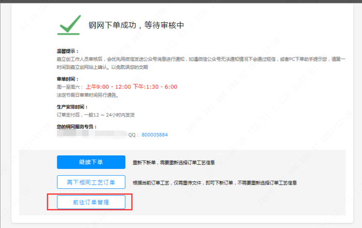 上傳文件成功后,下單結(jié)束,返回訂單管理,等待嘉立創(chuàng)工作人員審核訂單。