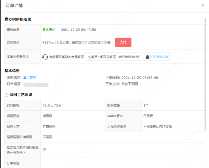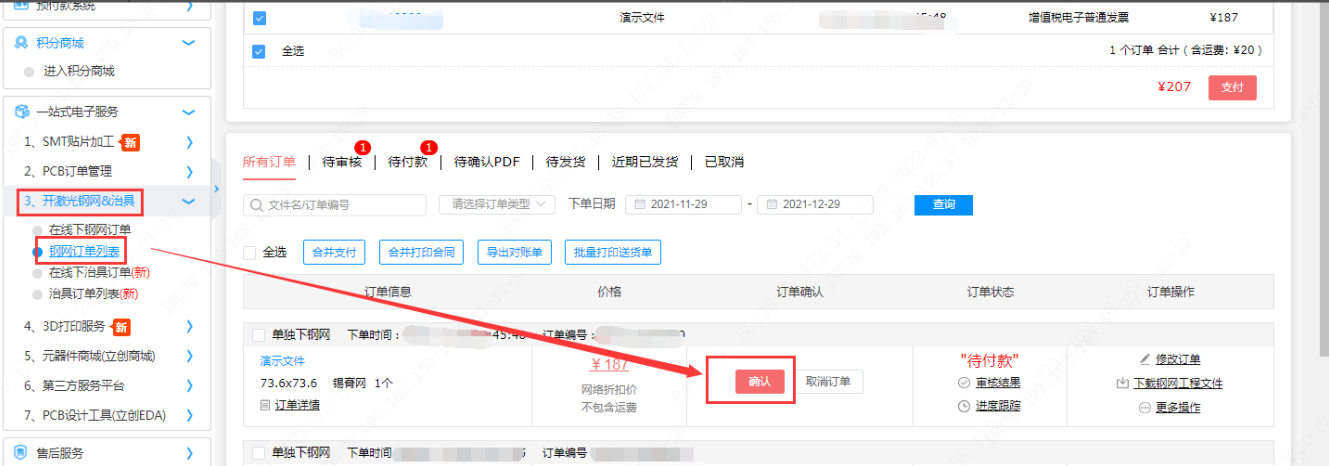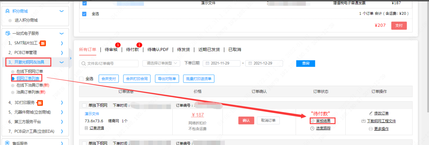 1. 嘉立創(chuàng)市場人員審核好訂單之后,這個訂單狀態(tài)就會顯示:待付款。 請先點開審核結(jié)果確認(rèn)工藝與價格是否有誤。