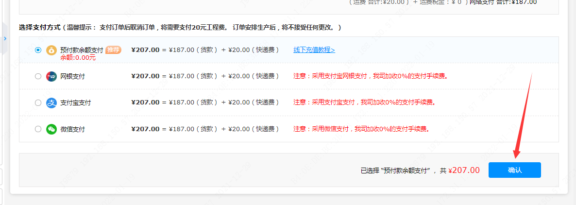 3.在下面的支付方式選擇界面,有幾種方式供選擇:賬戶余額支付、微信、支付寶、網(wǎng)銀支付。 嘉立創(chuàng)推薦系統(tǒng)賬戶余額支付,有優(yōu)惠并且可公對公打款。