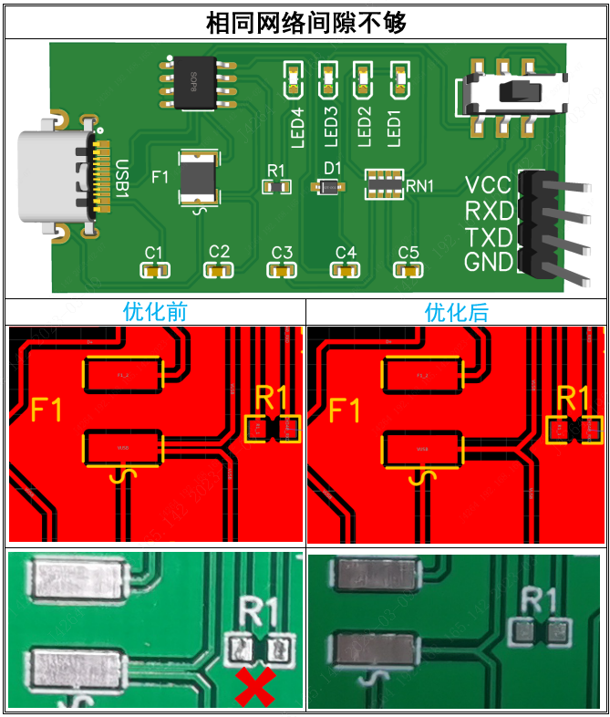我司采用干膜工藝生產(chǎn),為避免干膜碎對PCB造成開短路的不良,對于相同網(wǎng)絡的間隙要求0.254mm(相關說明詳見下單前技術員必看)