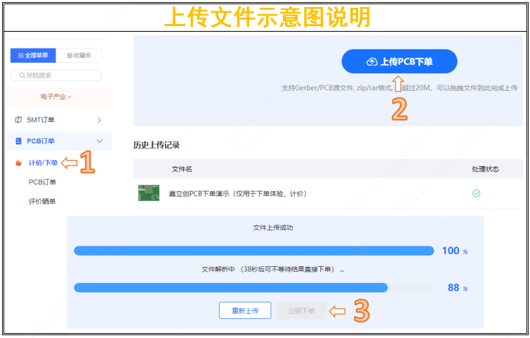 2)上傳PCB下單壓縮包文件(支持AD、PADS格式的原PCB文件,及RS-274X的GERBER文件)