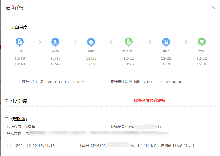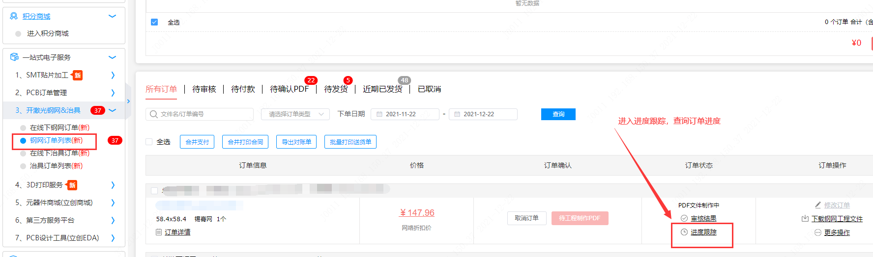 如需查看鋼網(wǎng)生產(chǎn)進(jìn)度,可以在【 鋼網(wǎng)訂單列表---》進(jìn)度跟蹤 】查看生產(chǎn)進(jìn)度,若訂單已發(fā)貨,可以查看快遞進(jìn)度。