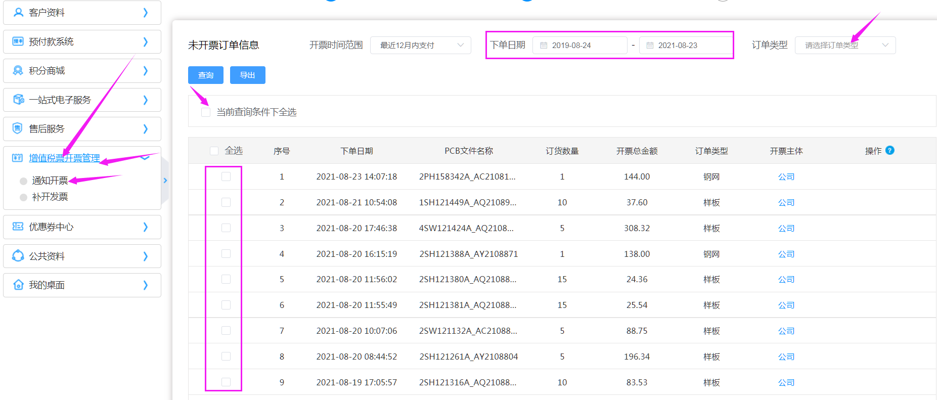 點(diǎn)通知開(kāi)票后下一步:當(dāng)選中通知開(kāi)票,則彈出未開(kāi)票訂單信息列表,則你選中所需要的開(kāi)票訂單,然后點(diǎn)提交!