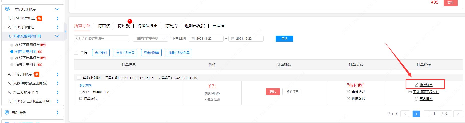 如您在下單后想修改訂單信息,未付款訂單可直接在系統(tǒng)上進(jìn)行修改。如下圖所示,