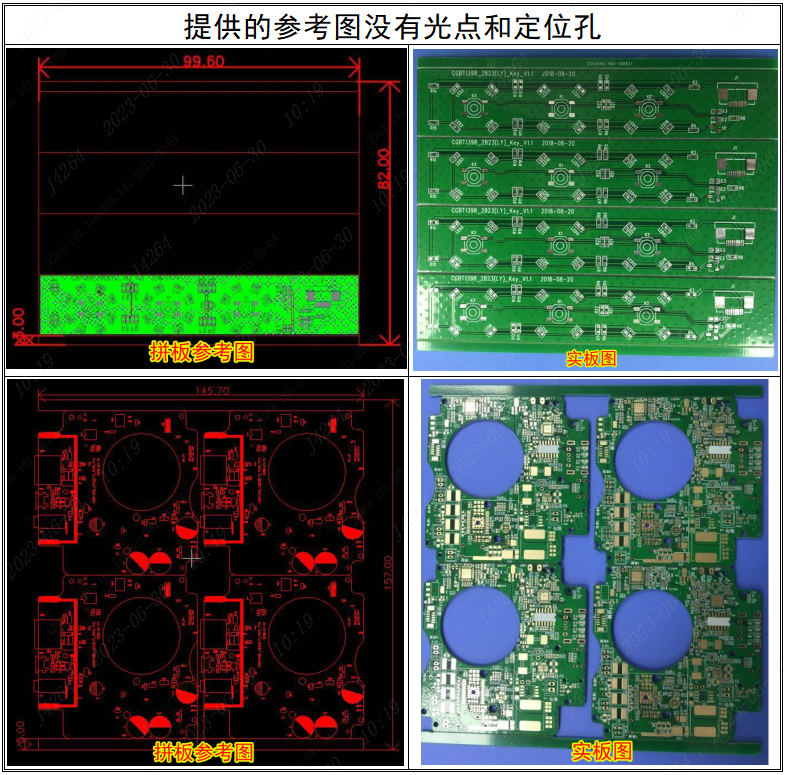 ■ 客戶提供的拼板圖沒有光點定位孔等指示數(shù)據(jù),實板也沒有光點和定位孔導致SMT不便組裝