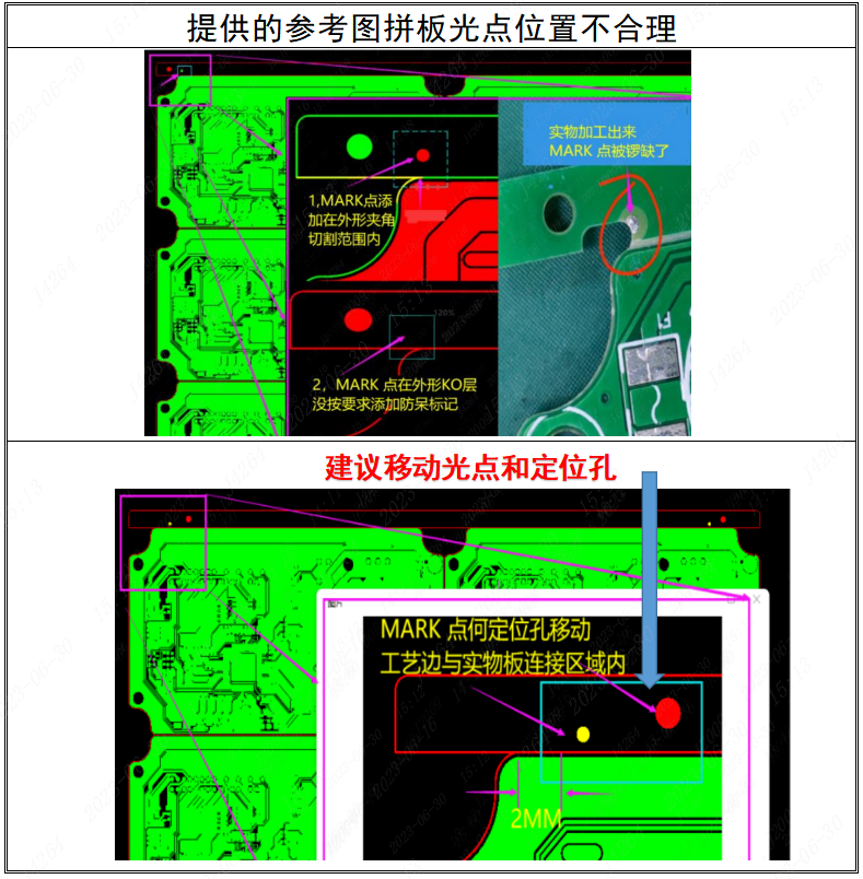■ 改善優(yōu)化方案:當發(fā)現(xiàn)拼板圖中會出現(xiàn)破壞光點或定位孔/工藝邊的,我們適當調(diào)整或移動光點/定位孔位置