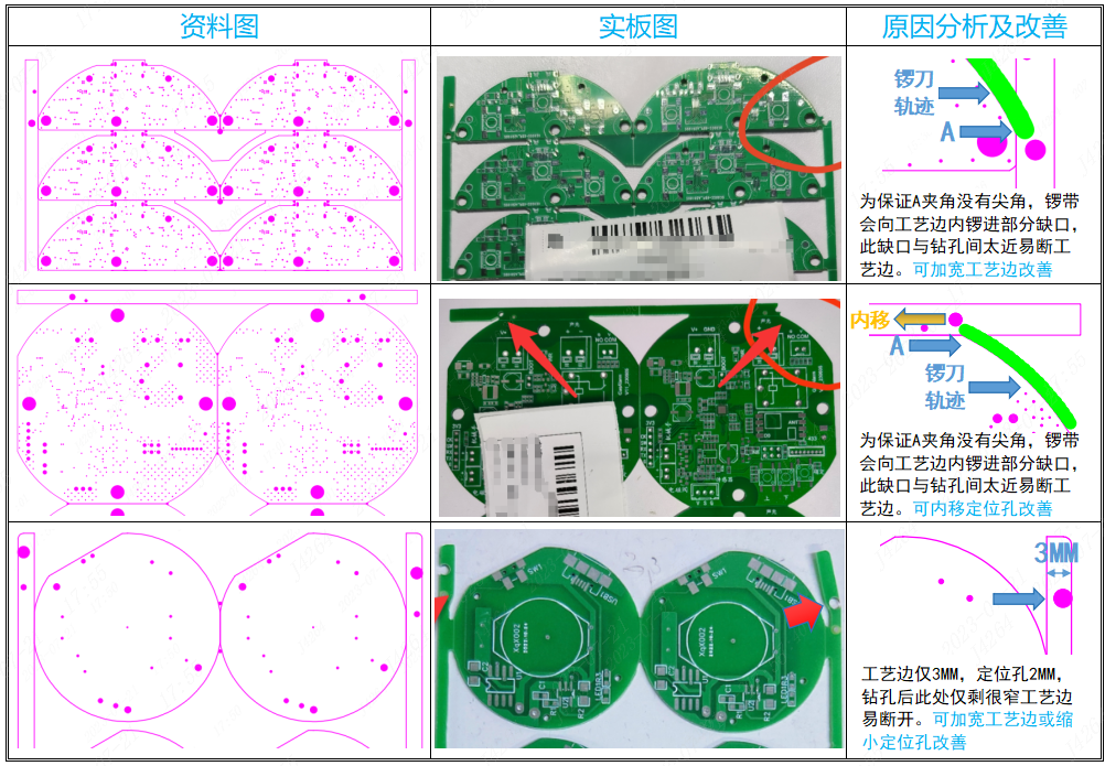 我們先分析常見的幾種工藝邊與定位孔不協(xié)調(diào)導(dǎo)致的工藝邊斷開情況(光點(diǎn)的位置同樣請考慮好):