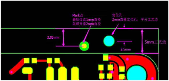 結(jié)合我司SMT的加工工藝,我們建議工藝邊按5MM來設(shè)計(jì),定位孔大小按2MM,光點(diǎn)大小按1MM,距板邊3.85MM,具體見圖示: