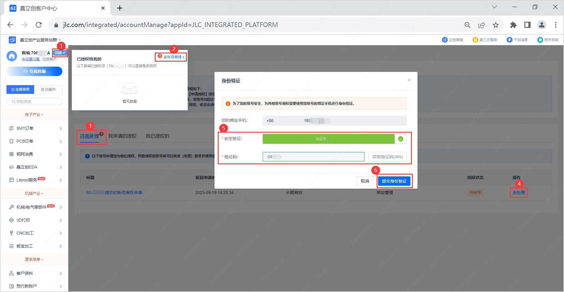登錄被申請授權(quán)的賬號,進(jìn)入“ 多賬號管理 ” 頁面,在 “ 待我處理 ” 中查看授權(quán)申請,點(diǎn)擊 “ 去處理 ”,進(jìn)行身份驗證,核對申請信息,進(jìn)行審核處理。