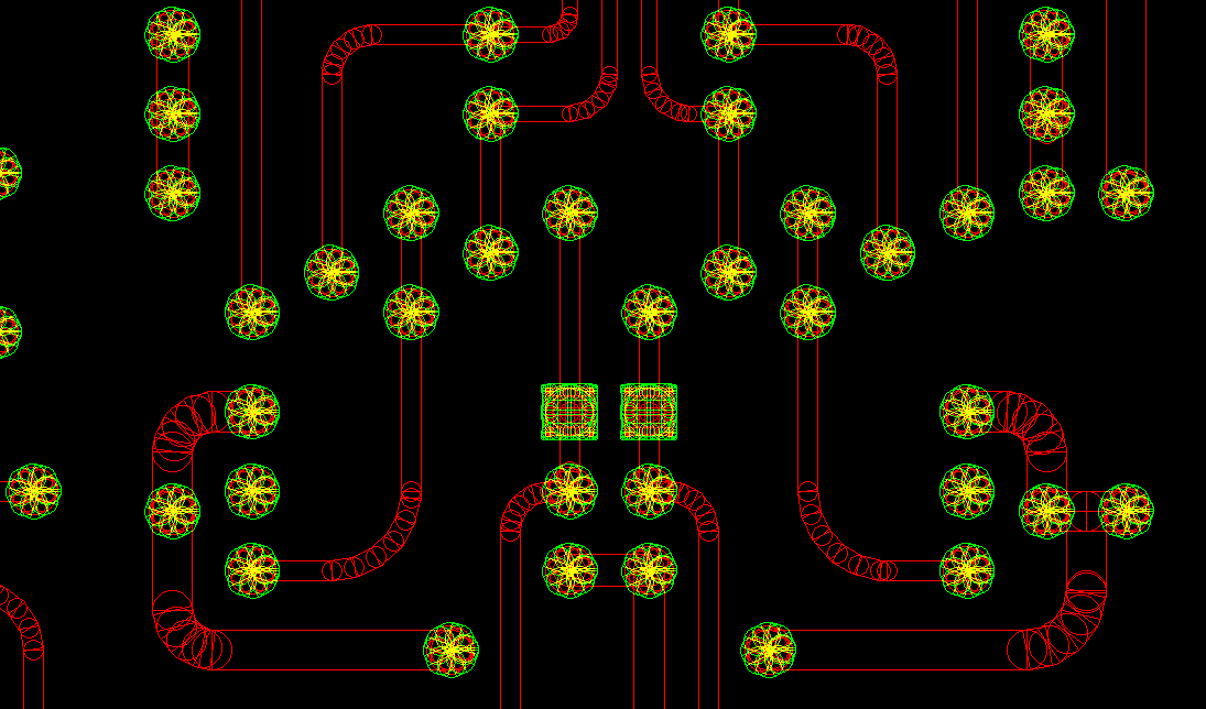 針對(duì)上圖所展示的案例,我們的建議的方法是,原稿的PAD盡量設(shè)計(jì)成下面的效果,每個(gè)PAD都是獨(dú)立的圖元,大多數(shù)是圓形,或者矩形,不要求所有的PAD都這樣,能達(dá)到八成以上就可以,比如過孔的PAD設(shè)計(jì)成圓形是一點(diǎn)問題都沒有。