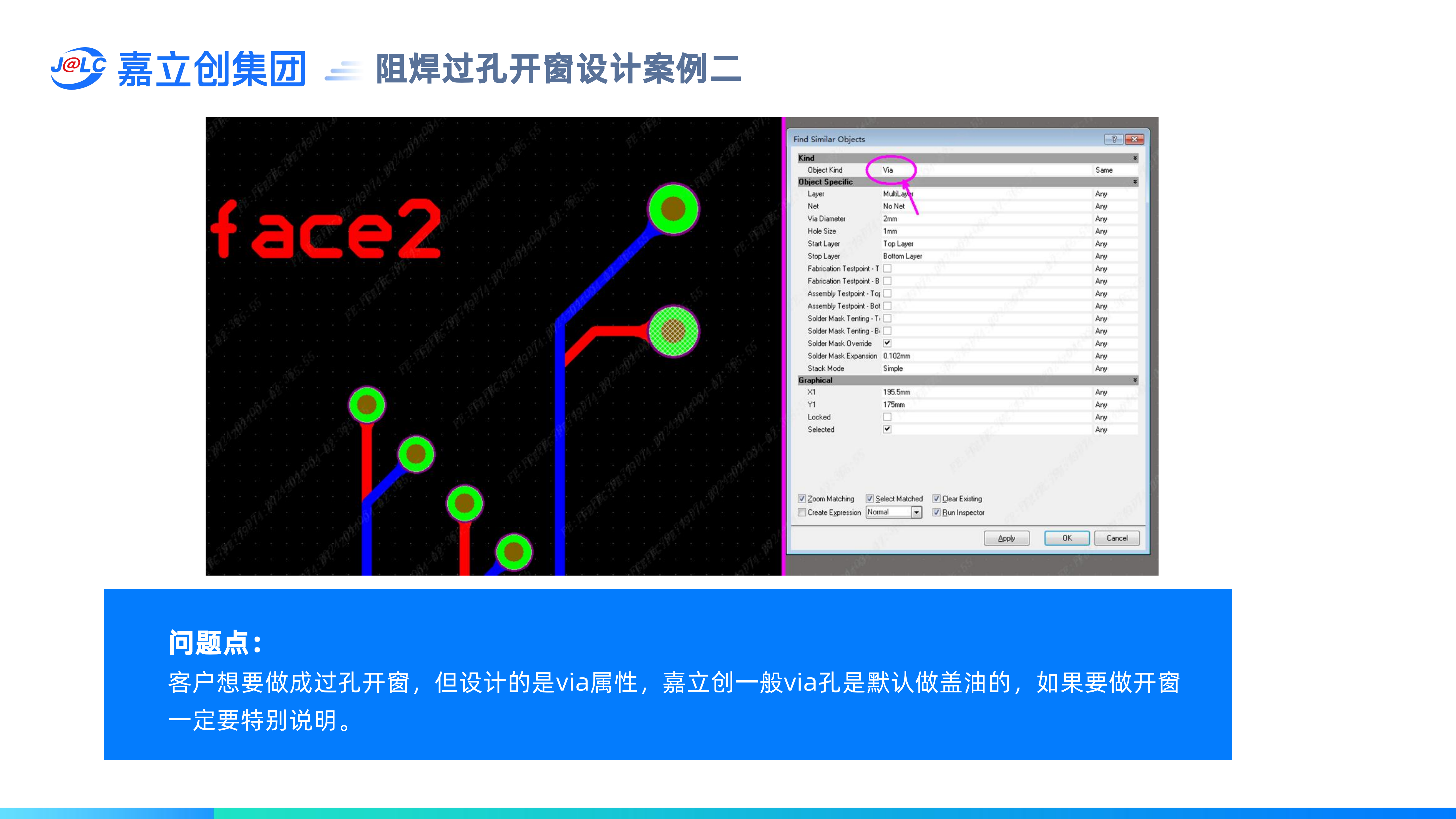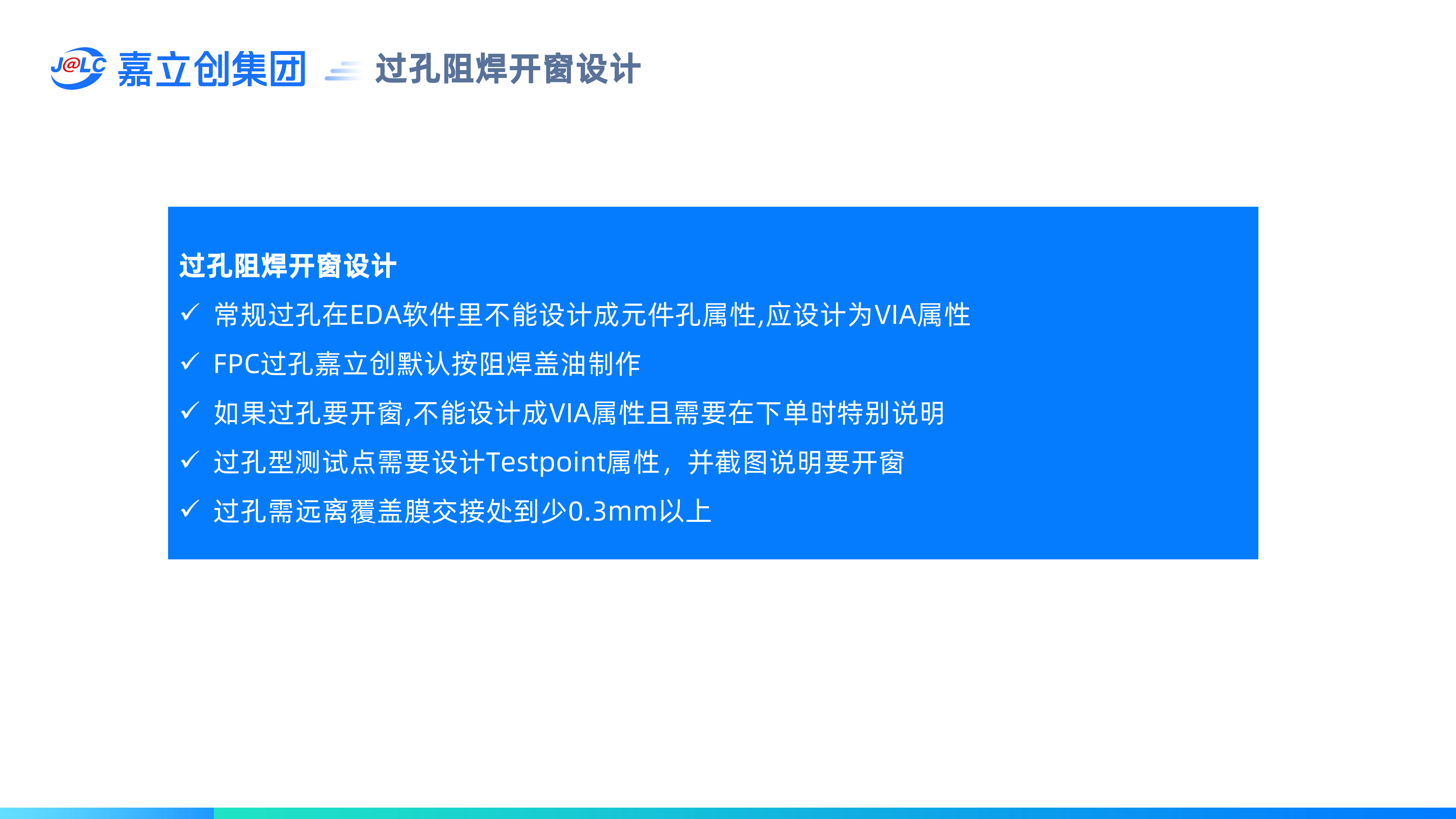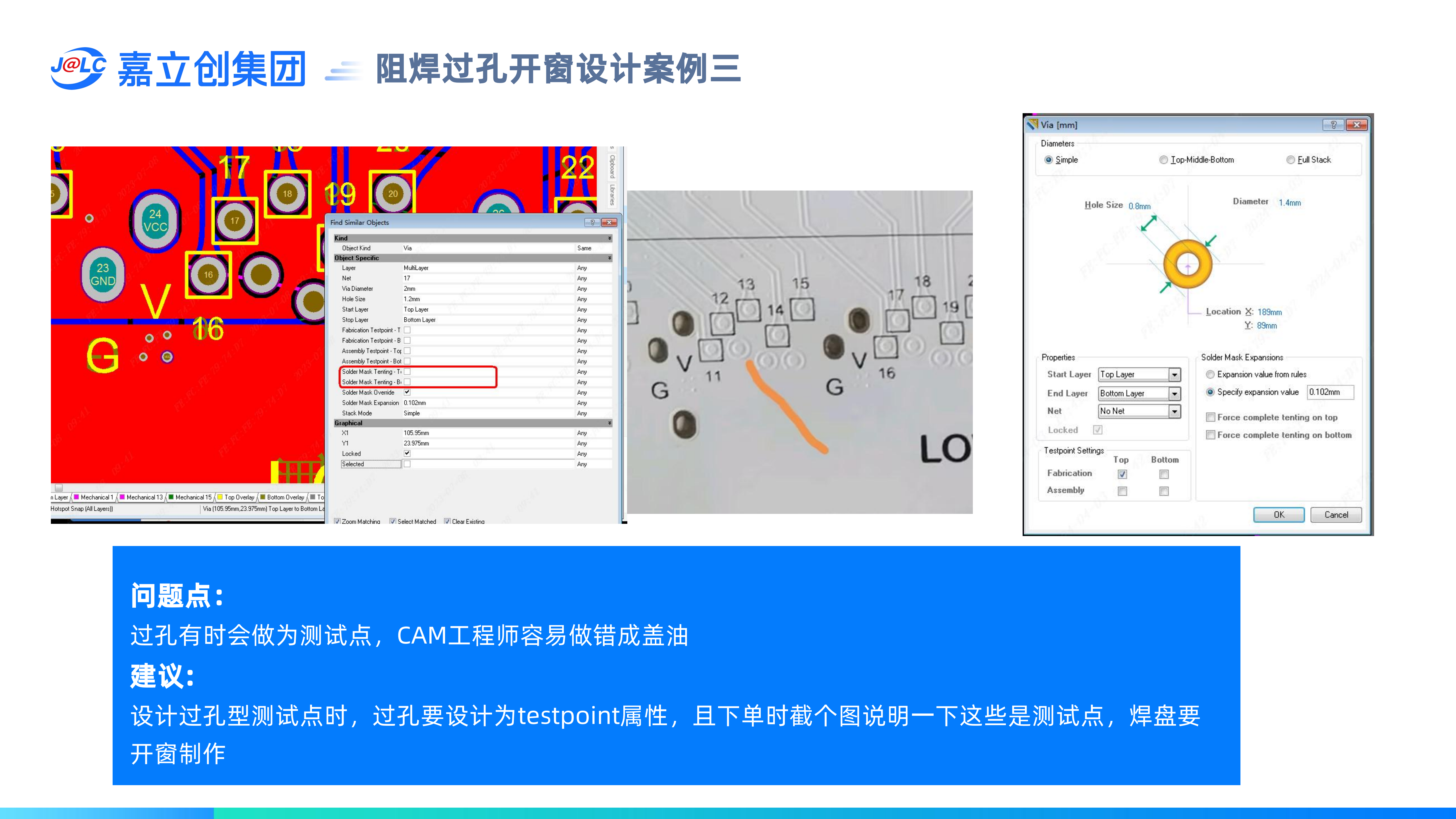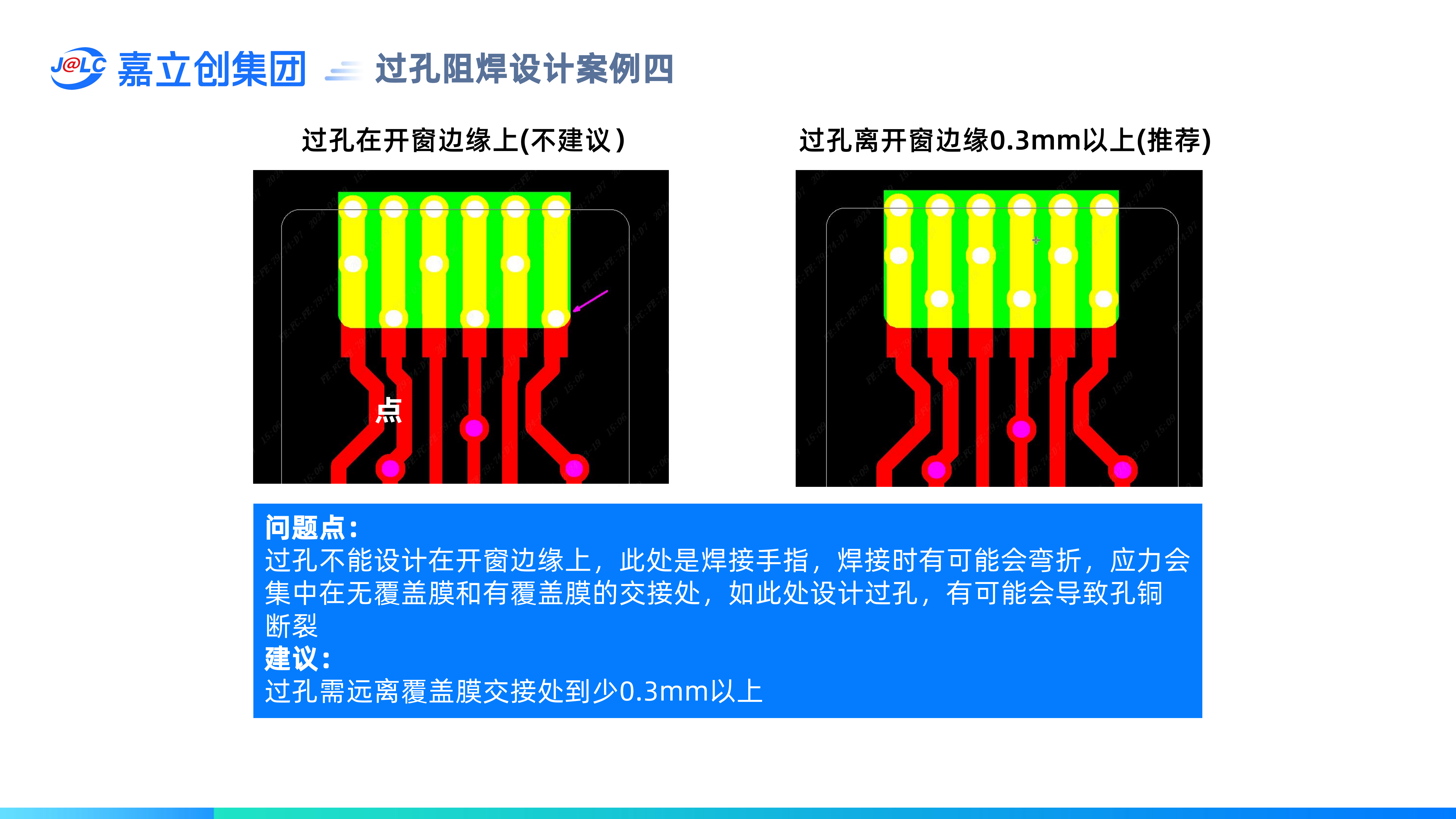 過(guò)孔阻焊開(kāi)窗設(shè)計(jì):(1)過(guò)孔在EDA軟件里不能設(shè)計(jì)成元件孔屬性;(2)過(guò)孔嘉立創(chuàng)默認(rèn)按阻焊蓋油制作,如果要開(kāi)窗需要特別備注(如過(guò)孔型測(cè)試點(diǎn));(3) 過(guò)孔不能一半開(kāi)窗,一半蓋膜,需要保留0.5mm以上的安全間距。