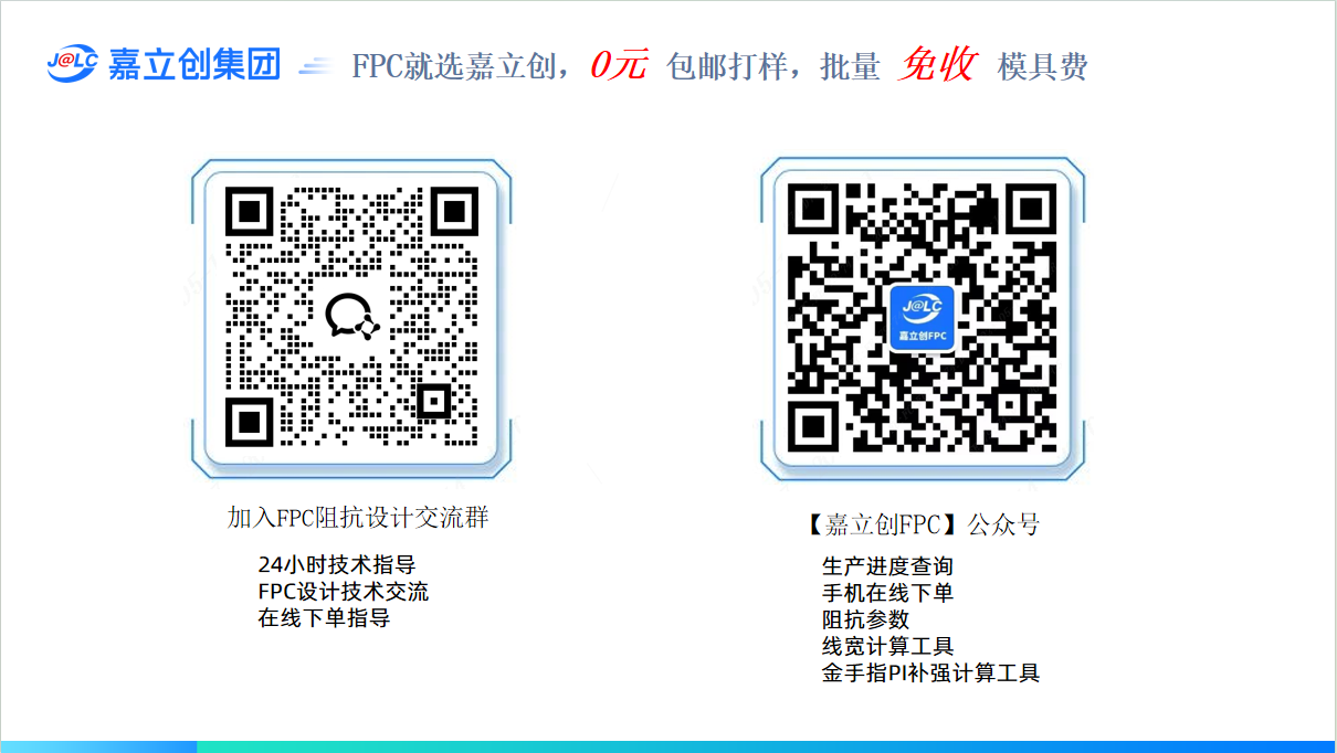 FPC阻抗使用阻抗模擬軟件很難計算準確,可參考嘉立創(chuàng)實際總結的經(jīng)驗線寬來設計,因嘉立創(chuàng)FPC暫時沒有提供測試阻抗的服務,建議先打樣驗證。如需技術交流,可掃碼聯(lián)系技術人員。(需要注意,按以下線寬直接下單 ,阻抗公差約在+/-20%左右,如有公差要求,需要聯(lián)系嘉立創(chuàng)技術人員)